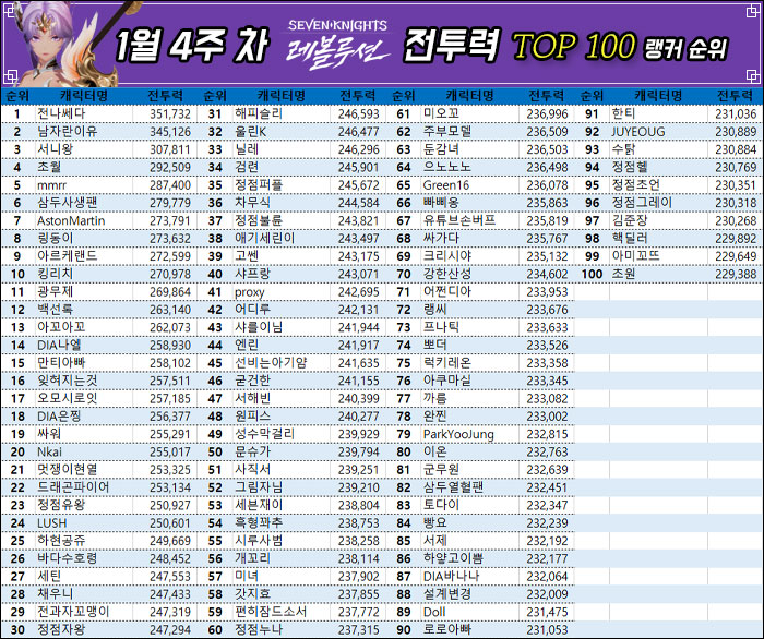1월 4주차 전투력 TOP 100 랭커의 평균 전투력은 246,058으로, 1월 3주차와 비교했을 때 무려 17,000 가량 상승했다.