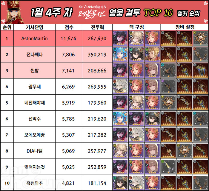 AstonMartin 유저는 영웅 결투 1월 4주차에도 1위를 기록하면서 4주 연속으로 최정상 타이틀을 이어가고 있다. 특히 2위 전나쎄다 유저와 큰 점수 차로 안정적으로 1위를 계속 유지할 것으로 보인다. 지난주에 이어 전나쎄다 유저와 찐빵 유저의 치열한 2위 자리 싸움이 계속되고 있다.