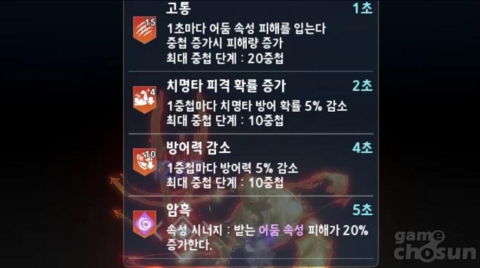 덕분에 약화 공격은 액티브 스킬 '철저한 준비'의 연계로 발동시켜 많은 피해를 입힐 수 있으며, '저주의 끝' 액티브 스킬 적중 후에 고통 공격으로 결정타를 날리는 것이 가능하다. 또 속성결정 상태일 때 발동 가능한 '속성 시너지' 특수기로 고통 15중첩 효과를 낼 수 있는 점도 눈여겨볼만하다.
