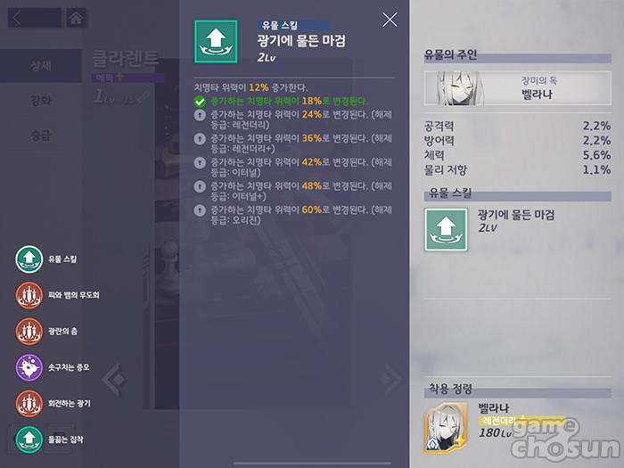 벨라나는 패시브 스킬로 '들끓는 집착'을 보유하고 있다. 출혈에 걸린 대상에게 항상 공격이 치명타로 적용되며, 흡혈 능력치가 최대 40%까지 적용돼 생존 능력이 향상된다. 이 치명타 옵션은 유물 스킬인 '광기에 물든 마검'과도 연계가 된다. 광기에 물든 마검은 심플하게 '치명타 위력 증가' 효과를 가지고 있어 출혈 상태의 적을 상대로 강력한 효과를 보여준다.