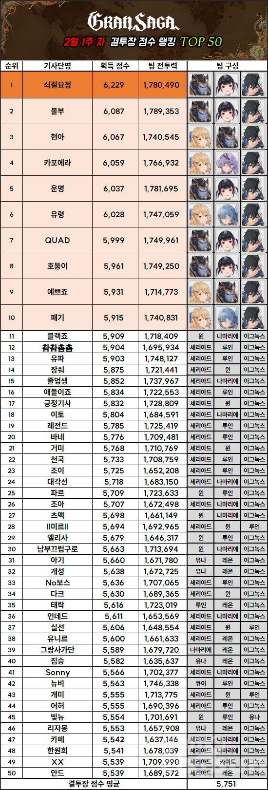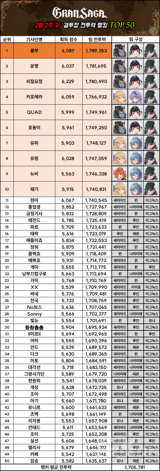 그랑사가 105주 차 결투장 랭킹 점수 1위는 '쇠질요정', 전투력 1위는 '볼부'가 차지했다.