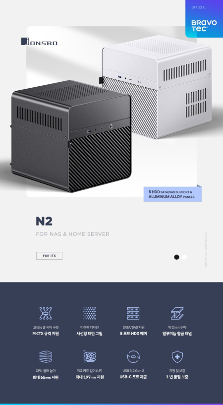 JONSBO N2 For NAS는 2mm 두께의 견고하고 고급스러운 알루미늄 외부 패널과 1mm 내부 스틸 프레임을 기반으로 큐브 타입의 유니크한 디자인, 올 화이트 및 올 블랙 색상 구성으로 인테리어 및 데스크테리어에 최적화된 것이 특징이다.