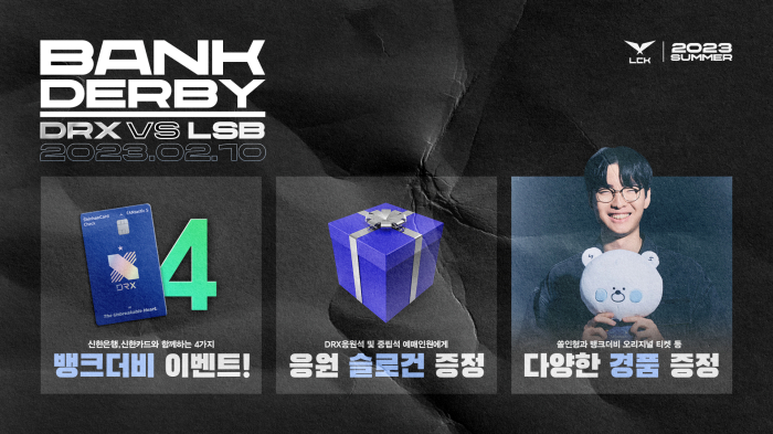특히 이번 이벤트는 2023년 첫 뱅크더비인 만큼 많은 팬들이 참여할 수 있도록 기획되었다. 먼저 경기 당일 롤파크를 방문하는 팬들 중 신한은행 DRX 적금상품 가입 인증, 신한카드 DRX 체크카드 발급 인증, 뱅크더비 기념 인스타그램 필터 촬영을 인증할 시 뱅크더비 특별 경품이 지급된다. 경품은 2023 DRX 유니폼을 입은 신한 쏠 인형과 뱅크더비 한정으로 지급되는 2023 뱅크더비 오리지널 티켓이다. 더불어 뱅크더비 승리 시 DRX 체크카드 보유 인원 대상으로 마이신한포인트 5,000,000포인트가 분할 지급된다. 또한, 추첨을 통해 2023 스프링 유니폼 자켓도 증정될 예정이다.