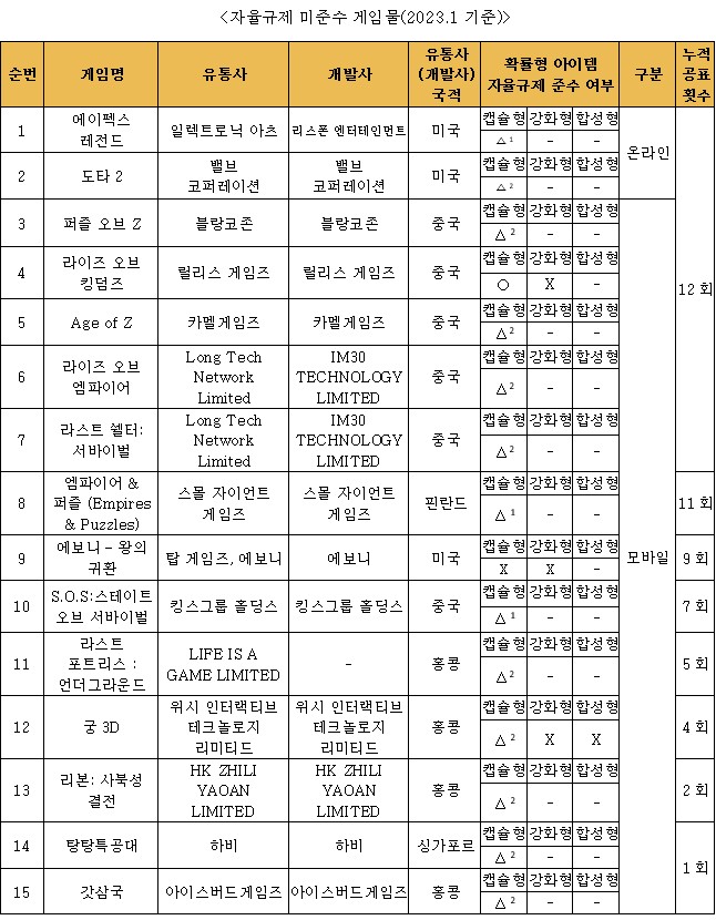이에 따라 GSOK 내(內) 자율규제평가위원회(위원장 황성기)는 2023년 1월 기준으로 총 15종(온라인 2종, 모바일 13종)의 자율규제 미준수 게임물을 공개한다고 밝혔다.