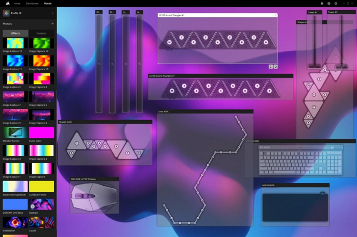 ‘뮤럴 라이팅’은 직관적인 쌍방향 도구로써 iCUE 소프트웨어를 통해 커스텀 RGB 효과를 전례없이 빠르게 생성한다. 이미지, GIF, 영상을 뮤럴에 업로드한 후 RGB 장비들과 온스크린을 연동하면 RGB 셋업 전체에 화려한 비주얼을 적용할 수 있다. 플랫폼 자체는 간단하고 사용이 쉬우면서 재미까지 살려 게임룸이 새로운 조명 효과마다 활기차게 꾸며지는 모습도 즐길 수 있다.