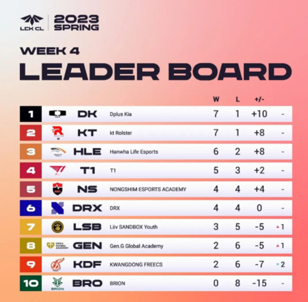 지난 주 kt 롤스터가 7연승 중인 디플러스 기아를 상대로 승리하면서 기세를 올리고 있다. kt 롤스터는 2승을 추가하며 2위를 유지하는 동시에 1위 디플러스 기아를 승점 2점차로 바짝 쫓고 있다. 종합순위 3위인 한화생명e스포츠 또한 2승을 추가하며 승점 8점으로 최상위권 대결에 합류했다. 지난 주 역시 순위변동이 많지 않은 가운데, 광동 프릭스가 승수 추가에 실패하면서 9위로 내려앉았다.