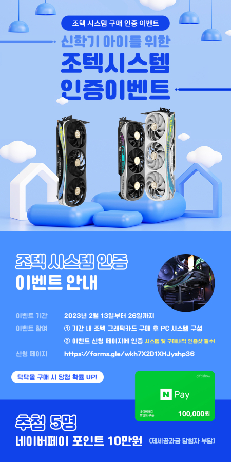 ‘조텍 신학기 시스템 인증 이벤트’는 2023년 신학기 시즌을 맞아 PC를 새롭게 맞추는 학생 및 학부모들을 위해 마련된 행사다. ZOTAC GAMING 지포스 그래픽카드 구매 후 장착한 시스템 사진을 인증하면 추첨을 통해 총 5명에게 ‘네이버페이 포인트 100,000원’을 경품으로 증정한다.