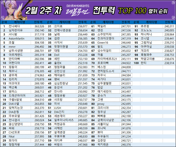 2월 2주차 전투력 TOP 100 랭커의 평균 전투력은 256,524로, 지난주 대비 2,888이 증가했다.