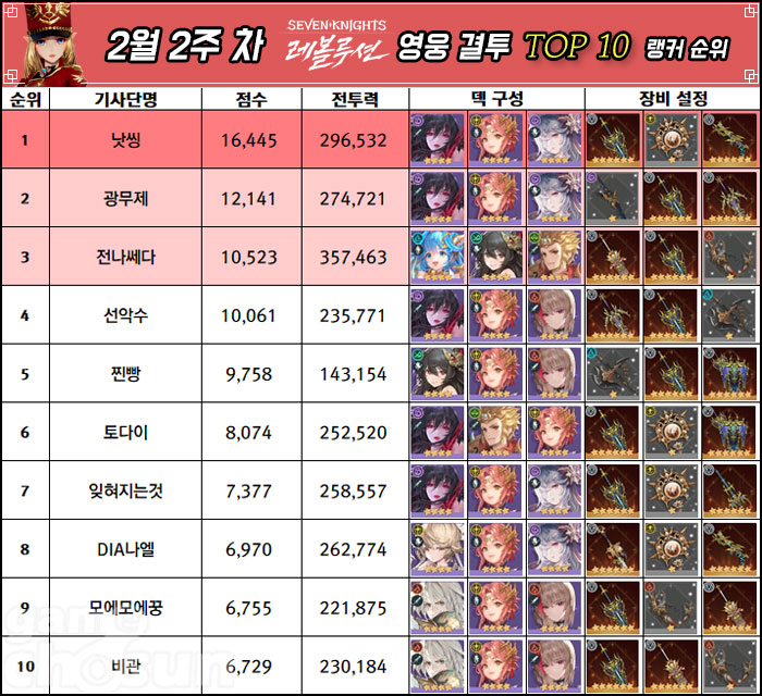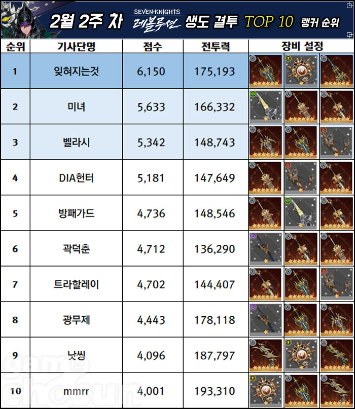 생도 결투의 무기 조합은 2월 1주차와 크게 달라진 바가 없으며, 영웅 결투에서는 '악마의 화신 세인'과 '창천도의 수호룡 이랑', 그리고 '언령의 인형술사 게헨나' 조합의 픽률이 더욱 상승한것으로 나타났다.