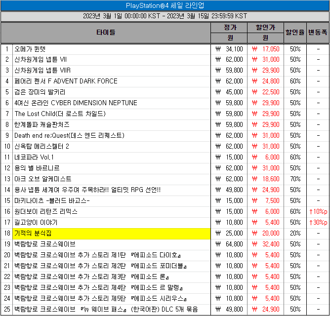특히, 최근 플레이스테이션4로 1월 26일 출시한 ‘기적의 분식집’과 닌텐도 스위치로 11월 24일 출시, 밸브 ‘포탈’의 ‘지프 바넷(Jeep Barnett)’이 영문 번역을 담당해 화제가 된 ‘세이비어 오브 디 어비스’가 새롭게 할인 프로모션 라인업에 합류해 선택의 폭을 넓혔다.