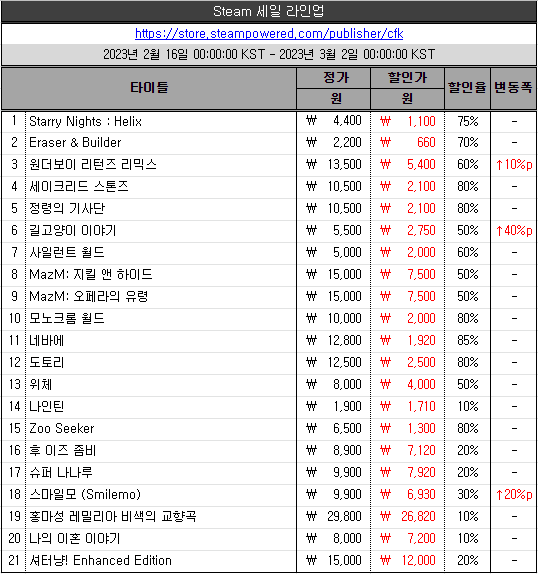 CFK 구창식 대표는 “2023년 계묘년을 맞이해 자사 라인업을 합리적인 가격에 만날 수 있는 기회를 마련했다.”며, “새롭게 라인업에 합류한 ‘기적의 분식집’과 ‘세이비어 오브 디 어비스’를 포함한 53종의 라인업을 즐겨보시기 바란다.”고 밝혔다.