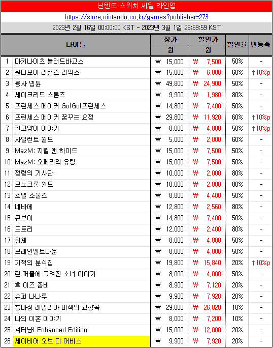 자사 신년 할인 프로모션의 플랫폼 별 기간으로는 닌텐도 스위치가 2월 26일 자정부터 3월 1일 23시 59분까지, 스팀이 2월 16일 자정부터 3월 2일 자정까지다. 플레이스테이션4는 3월 1일 자정부터 3월 15일 23시 59분까지 진행한다.