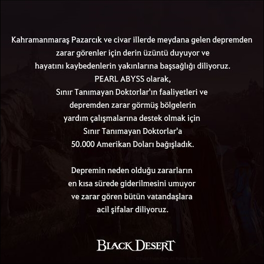 [자료제공 = 펄어비스] 펄어비스(대표 허진영)가 튀르키예 등 대규모 지진 피해 복구 및 구호 활동 지원을 위해 5만 달러를 오늘 (15일) 기부했다.