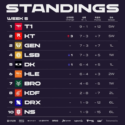 4주차에서 7승1패로 1위 자리를 되찾은 T1은 5주차에서 리브 샌드박스와 젠지를 연이어 상대했다. 두 팀 모두 6승을 기록하고 있었기에 T1이 패배할 경우 상위권이 혼란한 상황으로 빠져 들 가능성이 있었다.