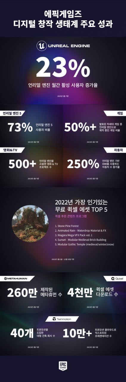 에픽게임즈는 언리얼 엔진의 월간 활성 사용자(Monthly Active Users, MAU) 수가 전 세계적으로 전년 대비 평균 23% 증가했다고 밝혔다. 가장 큰 성장세를 보인 곳은 약 40% 증가율을 기록한 북미였으며, 두 번째는 30%가 증가한 아시아였다. 지난해 4월 출시된 언리얼 엔진 5의 높은 사용률도 눈에 띄었는데, 전체 이용자 중 73%가 5 버전을 이용 중인 것으로 집계됐다.