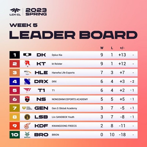 지난 5주차 경기는 디플러스 기아와 kt 롤스터가 각 2승을 추가하며 1, 2위 선두를 유지하는 가운데, DRX 또한 2승을 추가하며 순위가 6위에서 4위까지 상승했다. 젠지 글로벌 아카데미는 1승을 추가하면서 리브 샌드박스 유스와 7, 8위 순위를 교환했다.