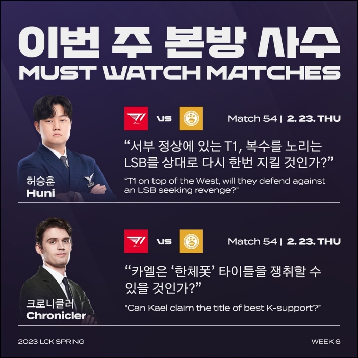 해설 위원들은 2023 LCK 스프링 6주 차에서 T1의 경기 결과를 유심히 지켜봐야 한다고 밝혔다. '후니' 허승훈 해설 위원은 23일(목) 열리는 T1과 리브 샌드박스의 경기를 추천하면서 "서부 정상에 있는 T1이 복수를 노리는 리브 샌드박스를 또 다시 격파하면서 1위를 지킬 것인지 관심이 모인다"라고 밝혔고 글로벌 해설 위원인 '크로니클러(Chronicler)' 모리츠 뮈센(Maurits Meeusen)은 "리브 샌드박스의 서포터 '카엘' 김진홍이 '한체폿(한국 최고의 서포터)'라는 타이틀을 가져갈 수 있을지 지켜볼 만하다"라고 관전 포인트를 전했다.