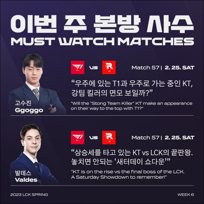'꼬꼬갓' 고수진 해설 위원과 '발데스(Valdes)' 브랜든 발데스(Brendan Valdes)는 25일(토) 펼쳐지는 T1과 KT 롤스터의 대결을 추천했다. 고수진은 "우주에 있는 T1과 우주로 가는 중인 KT 롤스터의 대결이기에 꼭 챙겨 봐야 한다"고 밝혔고 "브랜든 발데스는 "상승세를 타고 있는 KT와 LCK의 끝판왕인 T1의 새터데이 쇼다운이기에 놓치면 안된다"라고 기대감을 높였다.