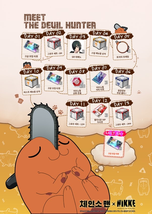 이번 콜라보레이션을 기념한 대규모 이벤트 ‘BULLET X CHAINSAW’는 3월 15일까지 진행된다. 14일간 누적 로그인 횟수에 따라 보상하는 이벤트, ‘체인소 맨’ 캐릭터들과 협력해 스토리를 풀어 나가는 이벤트 스테이지, 콜라보 전용 협동 작전 등이 펼쳐진다.