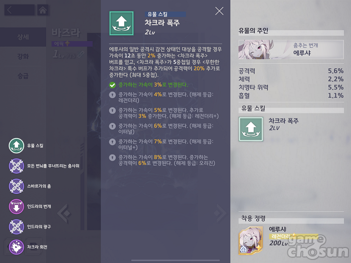 에루샤의 유물 바즈라는 에루샤가 일반공격으로 감전 상태의 적을 공격 시 가속 효과를 제공하는 차크라 폭주를 추가한다. 기본적으로 빠른 스킬 딜 사이클로 가속을 중첩시키고 5중첩을 통해 공격력 증가 버프를 보는 것이 에루샤의 기본 방식이다.