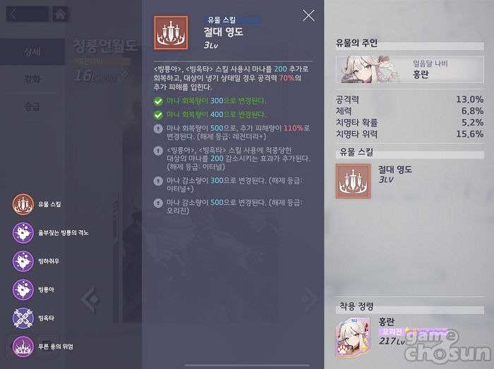 예외적으로 이터널 등급에 도달 시 빙룡아와 빙옥타에 대상의 마나를 감소시키는 효과가 부여된다. 메인 스킬과 얼티밋 스킬로 마나를 소모시키는 특징이 있는 홍란의 콘셉트를 제대로 살린 효과로 홍란을 주력 딜러로 채용하고 있다면 다른 유물과는 다르게 이터널까지는 노려보는 것도 좋다. 다만, 레전더리+에서 이터널 승급 시 조각이 700개나 필요하기 때문에 선택의 어디까지나 사용자의 몫이다.
