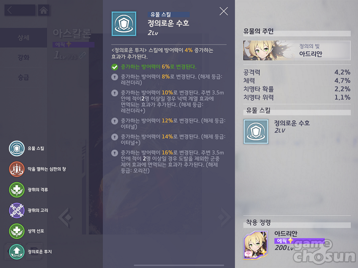 아드리안의 유물 아스칼론은 주변에 적이 많아질수록 공격력을 올려주는 패시브 스킬 '정의로운 투지'에 방어력 증가 효과를 부여하는 효과를 가지고 있다. 탱커이지만 다른 주요 탱커에 비해 좀 더 말랑하다는 평을 받는 아드리안의 생존력을 상승시켜준다.