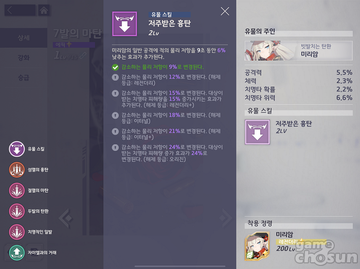 레전더리+시에는 물리 저항 뿐만 아니라 받는 치명타 피해량을 15% 늘려주는 효과가 추가돼 파티 전체의 화력이 상승하게 된다. 치명타에 특화된 린지나 벨라나 등과의 연계도 노려볼 수 있다.