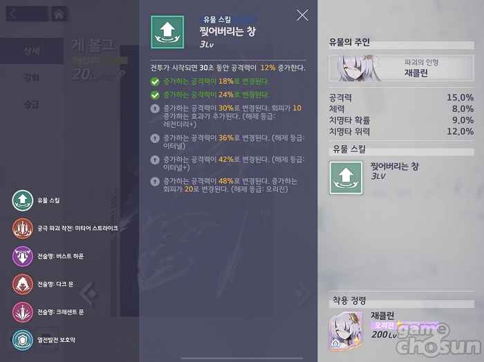 재클린의 유물 게 볼그는 전투 시작 시 30초 간 공격력을 상승시켜주는 간단하면서도 강력한 효과를 가지고 있다. 적 후열로 이동해 암살을 하는 재클린의 초반 화력을 극대화해주는 옵션으로 매력적이다.