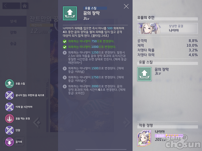 레전더리+시 꿈의 장막에 주변 적들에게 수면을 거는 효과가 추가돼 좀 더 안정적으로 후방을 지킬 수 있게 된다. 경우에 따라서는 전열에 배치하는 전략도 기대할 수 있다.