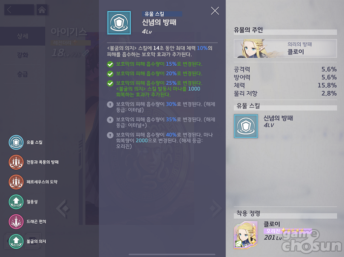 클로이의 유물 아이기시는 패시브 스킬인 불굴의 의지를 강화시켜 주는 스킬이다. 체력이 35% 이하로 내려갔을 때 저항을 올려주는 불굴의 의지에 최대 체력에 비례한 보호막을 추가해주는 효과로 클로이의 생존성을 극대화하는 스킬이다.
