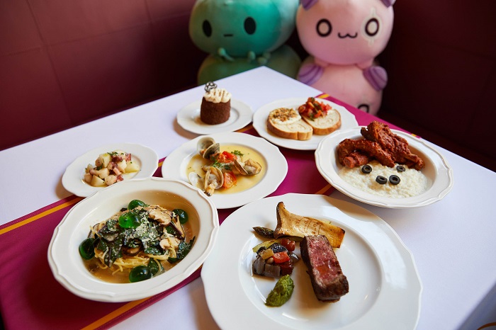 총 6가지 메뉴로 구성된 ‘웡스토랑’ 스페셜 코스는 부르스게타와 문어샐러드 에피타이저로 시작해 ‘메이플스토리’ 몬스터 캐릭터에서 영감을 받아 개발된 메인 요리 ‘헤네시스 주황 버섯 파스타’ 또는 ‘마늘 리본 돼지 갈비 리조또’로 이어졌다. 이후 두 번째 메인 요리로 지중해식 해산물 요리와 한우 스테이크가, 디저트로 다크 초콜렛 바나나 케이크와 음료가 제공됐다.