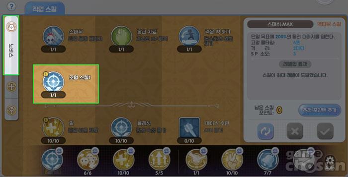 커스텀 스킬 조합을 완성했다면 다시 스킬 UI로 돌아와서 노비스 스킬군에서 조합 스킬을 선택, 최하단의 스킬 장착 칸에 배치해주면 된다.