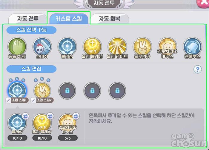 커스텀 스킬은 스킬 UI에 진입한 후, 창의 우측 하단 'Auto(자동전투)' 버튼을 눌러 세팅할 수 있는데, 자동 전투의 두 번째 탭에서 최대 5개의 커스텀 스킬을 만들어내는 것이 가능하다. '스킬 편집'에서 세팅할 스킬 조합을 선택하고, 해당 스킬 조합에 '스킬 선택 가능' 항목의 스킬을 최대 3개까지 차례대로 장착하면 된다.