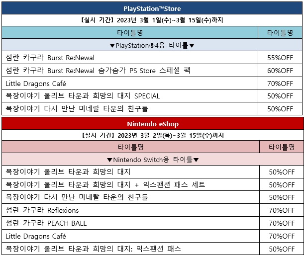 이번 할인 이벤트에서는 『섬란 카구라 Burst Re:Newal』, 『Little Dragons Cafe』, 『목장이야기 올리브 타운과 희망의 대지』 등 총 6개의 타이틀이 할인 판매 중이니 이번 기회에 꼭 플레이해보자.