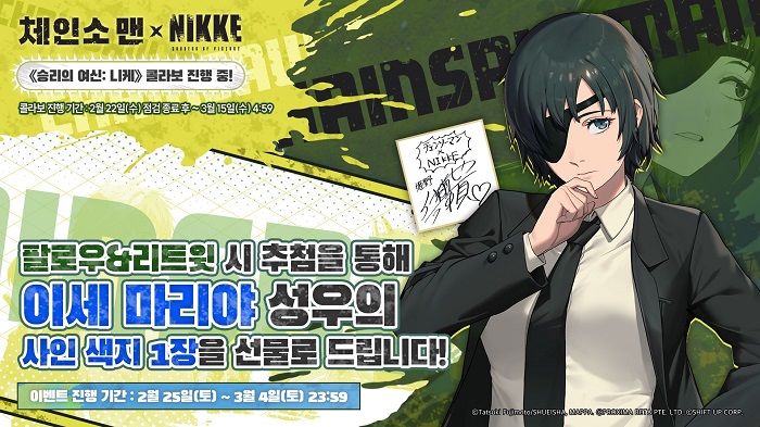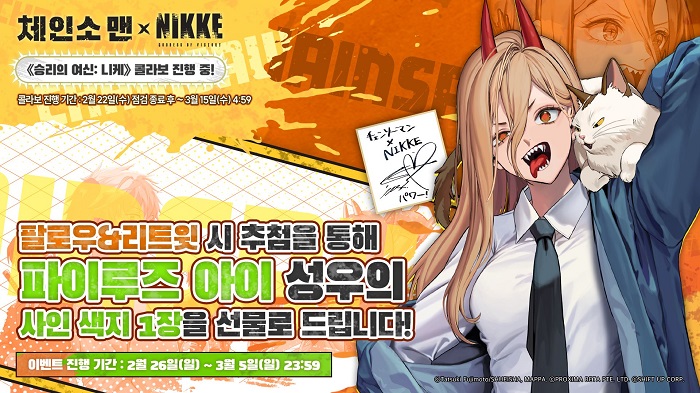 한편, ‘승리의 여신: 니케’는 지난 22일 인기 애니메이션 ‘체인소 맨’과 첫 컬래버레이션을 진행, 국내에서는 구글 매출 순위 TOP10 진입, 일본에서는 앱스토어 매출 순위 2위를 달성하는 등 기록적인 성과를 보이고 있다.
