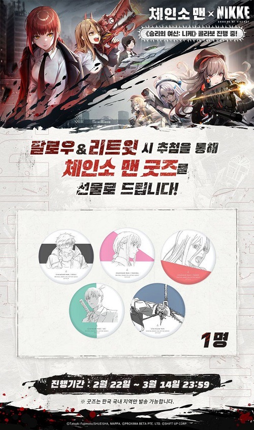 공식 커뮤니티 이벤트도 함께 진행된다. 먼저, 공식 트위터를 팔로우하고 성우 사인 증정 글을 리트윗하면 추첨을 통해 ‘마키마’, ‘파워’, ‘히메노’ 캐릭터의 성우 사인을 선물한다. 뿐만 아니라 오는 3월 14일까지 공식 트위터 계정을 팔로우하고 컬래버레이션 기념 이벤트 게시글을 리트윗하면 추첨해 ‘체인소 맨’ 뱃지 세트를 지급한다.
