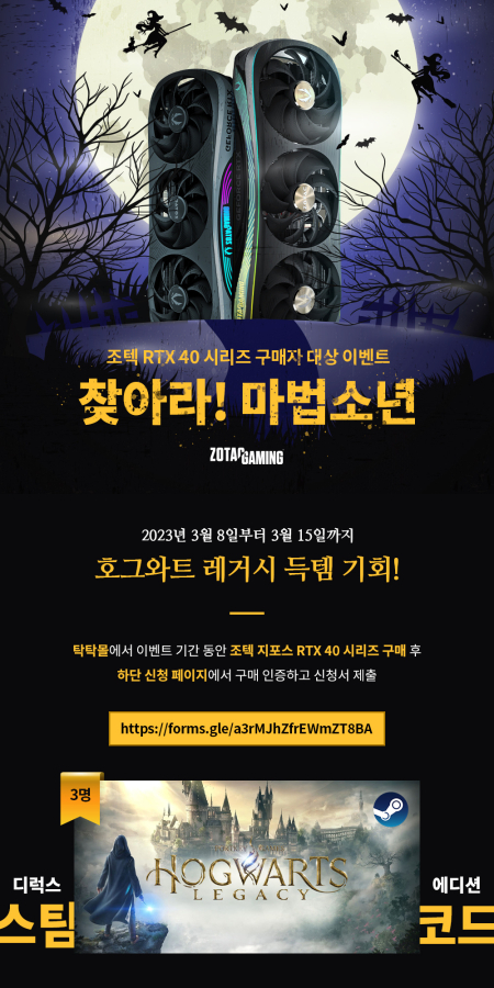 ‘찾아라! 마법소년 이벤트’는 조텍코리아 공식 쇼핑몰 탁탁몰에서 2023년 3월 1일 이후 ZOTAC GAMING 지포스 RTX 4090 시리즈, ZOTAC GAMING 지포스 RTX 4080 시리즈, ZOTAC GAMING 지포스 RTX 4070 Ti 시리즈 구매자 대상으로 진행된다. 본 이벤트에서는 추첨을 통해 최신 글로벌 인기 게임인 ‘호그와트 레거시 디럭스 에디션(스팀)’을 총 3명에게 증정한다.