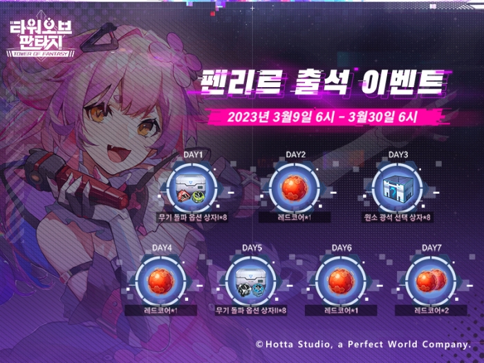 비글미 소녀 DJ 펜리르의 획득 확률 UP 이벤트는 오늘(9일)부터 3월 30일까지 진행되며 이벤트 기간 내 이벤트 주문 ‘마법의 족쇄’에서 펜리르 무기 글레이프니르와 칩셋을 획득할 수 있다. 또한 펜리르 출석 이벤트도 동시 진행한다. 이벤트 기간 동안 7일을 접속하면 무기 돌파 옵션 상자, 원소 광석 선택 상자와 레드코어 등 출석 보상과 누적 보상을 획득할 수 있다. 이외, 네메시스 복각 이벤트도 진행한다. 3월 9일부터 3월 15일까지 이벤트 주문 ‘신입 F-엔젤’에서 네메시스 무기 별의 계시와 칩셋을 획득할 수 있다.