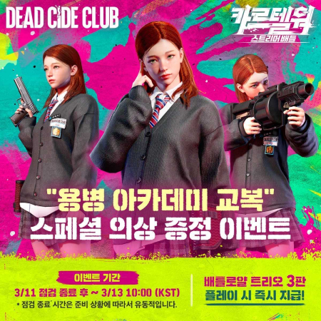이와 함께 카르텔 워를 기념해 데드사이드클럽 유저에게 ‘용병 아카데미 교복’ 치장 아이템을 증정하는 이벤트도 진행한다. 오는 11일부터 13일까지 배틀로얄 매치를 3회 진행 시 지급받을 수 있다.