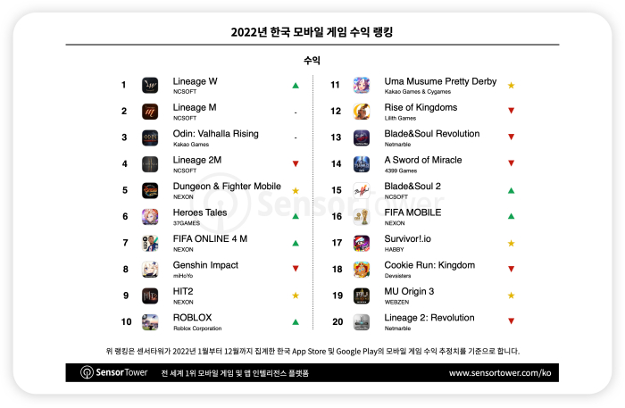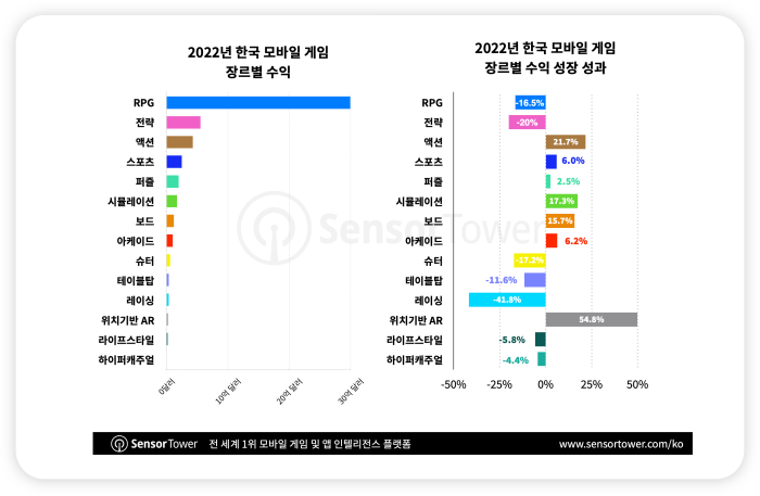 한국 시장은 총 14개의 한국 모바일 게임이 2022년 모바일 게임 수익 랭킹 TOP 20에 들며 한국 퍼블리셔가 계속해서 강세를 보이고 있으며, 그중 ‘리니지W’, ‘리니지M’, ‘오딘: 발할라 라이징’이 1위부터 3위를 차지했다. 2022년 한국 시장에서 1억달러의 수익을 돌파한 7개 모바일 게임 가운데 MMORPG가 5개로 가장 많았으며, 나머지는 액션과 스포츠가 각각 차지했다. MMORPG는 한국에서 가장 수익이 높은 RPG 하위 장르로, 해당 장르의 수익은 4년 연속 한국 모바일 게임 총수익의 80% 가까이 차지했다.