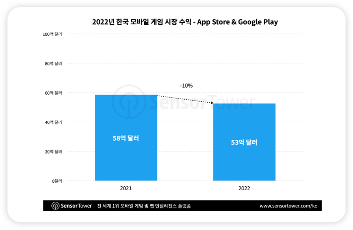 하지만 북미, 일본, 유럽 시장과 마찬가지로 국내 모바일 게임 시장 전체 수익은 2022년부터 하락세가 나타나며 53억달러의 수익을 올리는 데 그친 것으로 밝혀졌다. 안드로이드 소비자 지출이 12% 하락해 가장 뚜렷한 하락세를 보였다. 수익 점유율에서는 iOS 사용자와 안드로이드 사용자가 각각 20.4%와 79.6%를 차지했다.