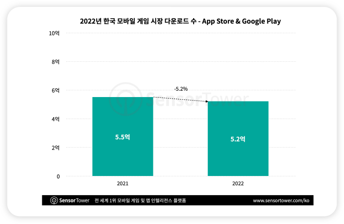 지난해 국내 모바일 게임 시장에서 다운로드 수는 5억2000만회를 기록해 전년 동기보다 5.2% 하락했다. 안드로이드 기기의 모바일 게임 다운로드 수가 8.3% 감소한 반면, iOS 기기의 모바일 게임 다운로드 수는 8.3% 증가했다. iOS와 안드로이드 사용자의 다운로드 점유율은 각각 21.1%, 78.9%로 2021년과 비교하면 iOS 시장의 점유율이 증가한 것으로 나타났다.