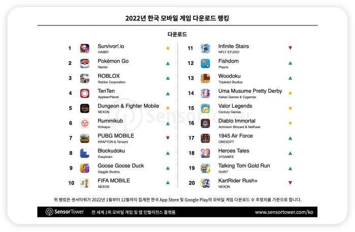 Habby가 출시한 로그라이크 핵 앤드 슬래시 게임 ‘탕탕특공대 (Survivor.io)’는 빠르게 한국 모바일 게임 플레이어들의 사랑을 받으며 6개월 만에 성공적으로 지난해 한국 모바일 게임 다운로드 랭킹 1위에 올랐다. 한국에서 이미 500만회 가까이 다운로드된 탕탕특공대의 뒤를 이어 ‘포켓몬 GO’와 ‘로블록스’가 각각 차트 2위와 3위를 차지했다.