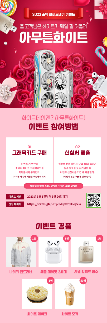 [자료제공 = 조텍코리아] 지포스 그래픽카드 전문 기업 조텍코리아(ZOTAC Korea, 대표이사 김성표)는 화이트 데이를 기념해 조텍의 화이트 제품 대상으로 경품을 증정하는 ‘조텍 아무튼 화이트 데이 이벤트’를 진행한다.