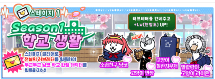 이벤트 기간 중 4종류의 한정 스테이지가 일주일마다 등장한다. 스테이지 1, ‘Season1 ~학교 생활~’이 현재 개최 중이며, 스테이지를 클리어하면, 기간 한정 “두근두근 냥코 학교” 이벤트 뽑기를 돌릴 수 있는 아이템, ‘전설의 러브레터’를 입수할 수 있다.