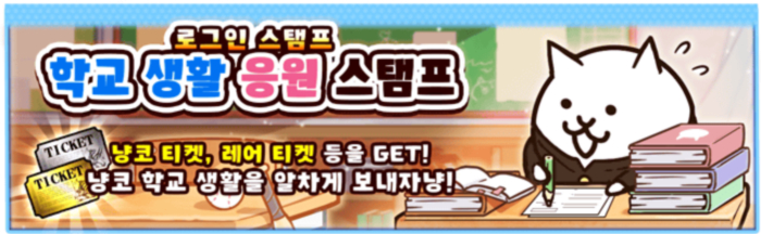 이벤트 기간 중, 매일 로그인하면 냥코 티켓이나 레어 티켓 또는 ‘전설의 러브레터’를 받을 수 있는 기간 한정 ‘학교 생활 응원 로그인 스탬프 캠페인’을 개최한다.