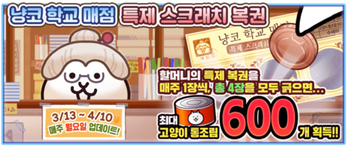 매주 고양이 통조림 획득 가능한 ‘냥코 학교 매점 특제 스크래치 복권’이 등장한다. 총 4장을 모두 긁으면 최대 고양이 통조림 600개를 획득할 수 있다.