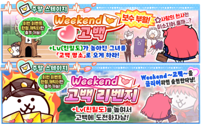‘전설의 러브레터’를 모아 한정 캐릭터 ‘소꿉친구 냥코’, ‘말괄량이 고양이 라이온’, ‘고양이 칠판지우개’, ‘고양이 반장’을 획득할 수 있으며, 주말에는 이벤트 뽑기에서 획득 가능한 위의 한정 캐릭터 4종만 출격 가능한 ‘Weekend ~고백~’ 스테이지가 등장한다.