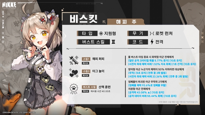 강아지처럼 귀여운 외모를 자랑하는 ‘비스킷’은 테트라 소속의 지원형 SSR 니케로 ‘해피퍼피’라는 런처를 사용하며, 지원형 스킬을 사용해 아군 전체의 사기를 높여준다.