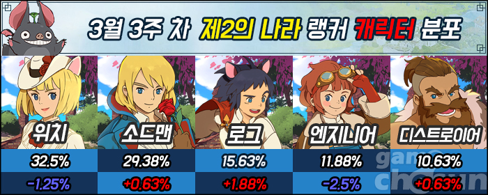 이번 랭킹에선 위치와 엔지니어 랭커들의 랭킹 점유율이 하락하는 모습을 보여줬다. 위치의 경우 전투력 관련 업데이트 직후 점유율이 크게 상승했다가 그 다음주 하락하는 모습을 보여줬기 때문에 평소와 비슷한 양상으로 보인다. 엔지니어는 지난 랭킹에서 점유율이 상승했지만, 다른 직업에 밀려 상승했던 것 이상의 하락을 보여줬다.